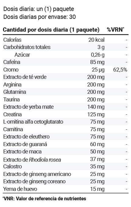 Complemento alimenticio con cafeína y extractos vegetales que ayudan a mejorar la concentración y la atención • Peso neto: 165 g (30 X 5,5 g)